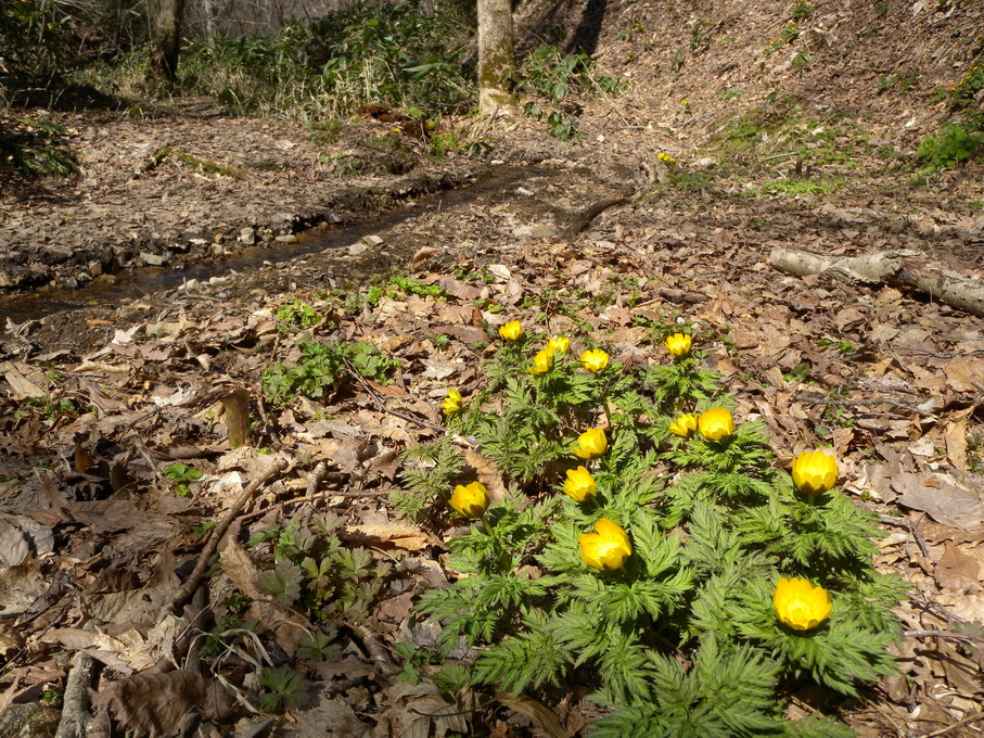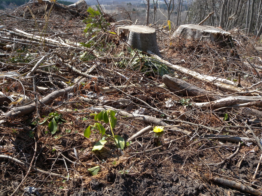 殺伐とした伐採地にポツンと咲く福寿草、隣はフッキソウ。
