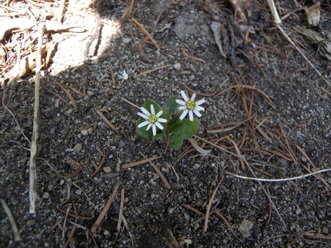 殺伐とした伐採地にポツンと咲く福寿草、隣はフッキソウ。