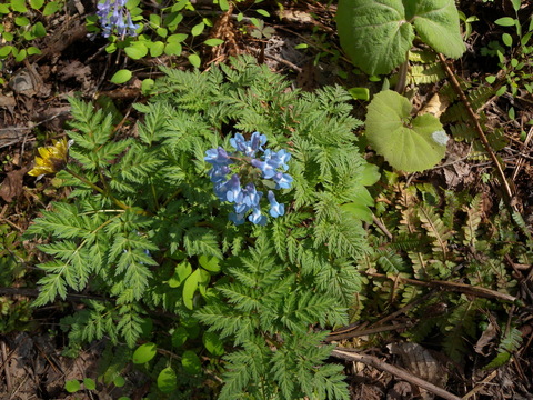 フクジュソウの葉から顔を出したエゾエンゴサク。